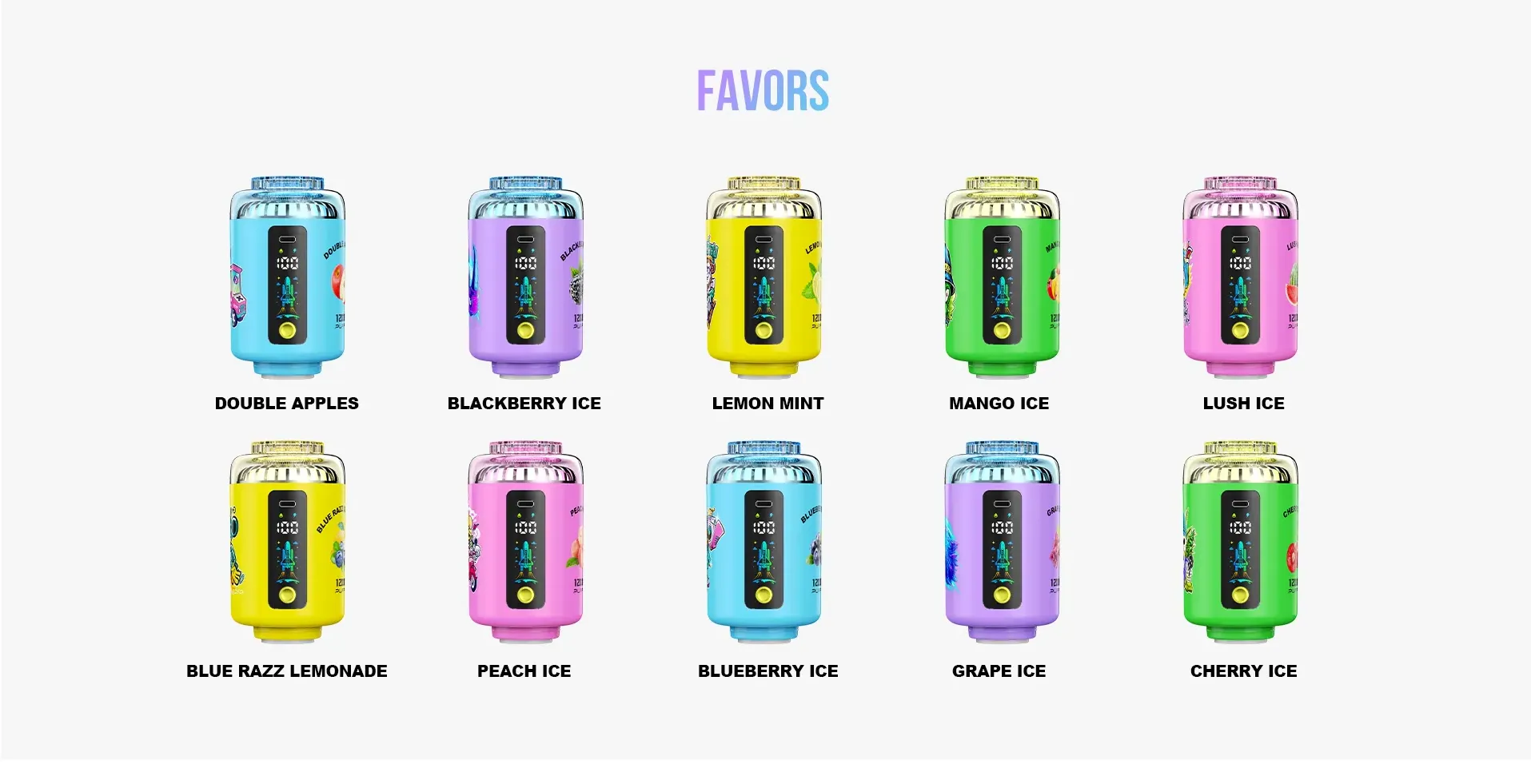 Naključni okusi ,1. Borovnica led ,2. Dvojno jabolko ,3. Limona meta ,4. Mango led ,5. Lubenica led ,6. Modra malina limona ,7. Breskev led ,8. Črna jagoda led ,9. Grozdje led ,10. Češnja led |