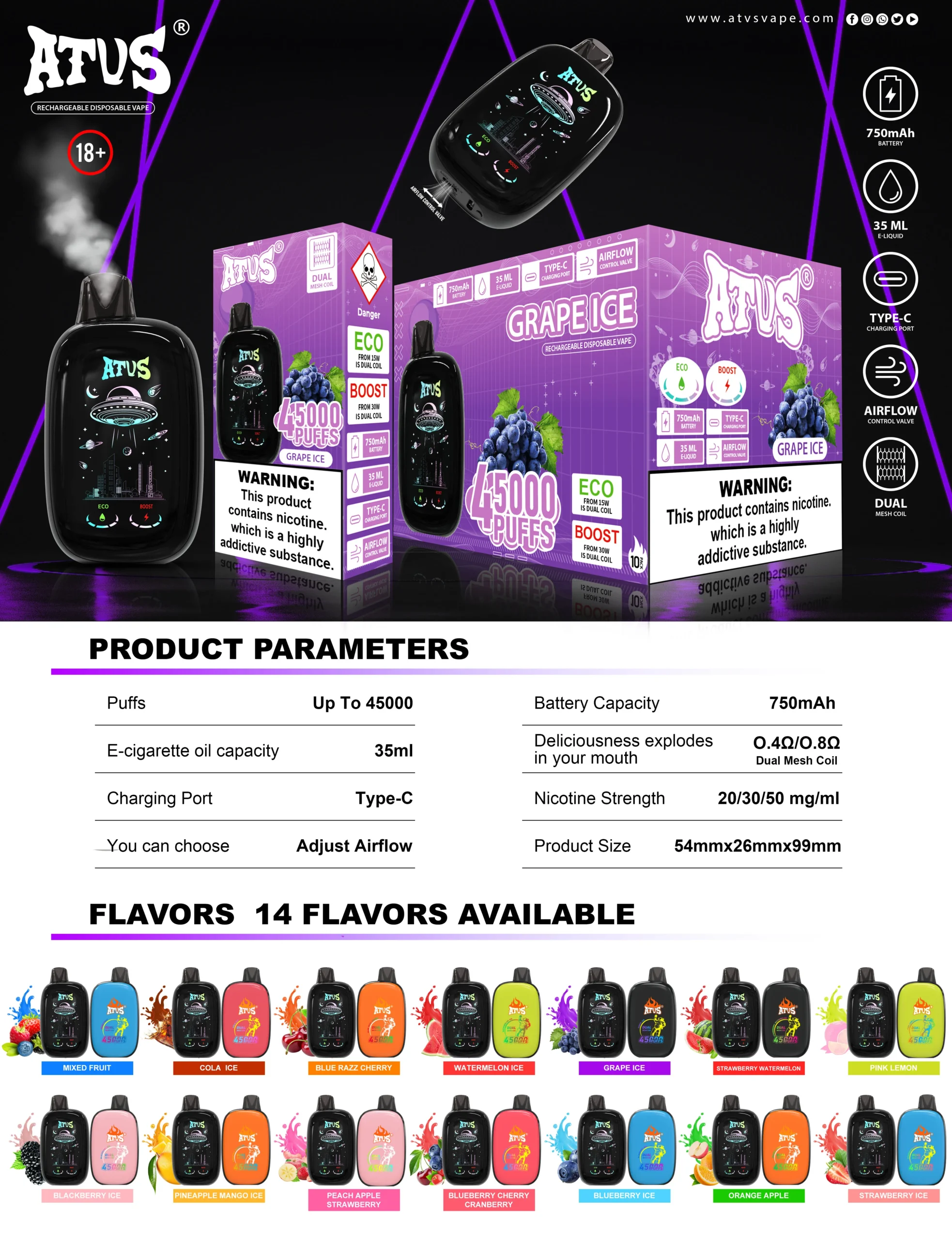 ATVS Smart Touch Screen 45000 PUFFS – 38 ml, 750 mAh Baterija & Dotikovni Zaslon