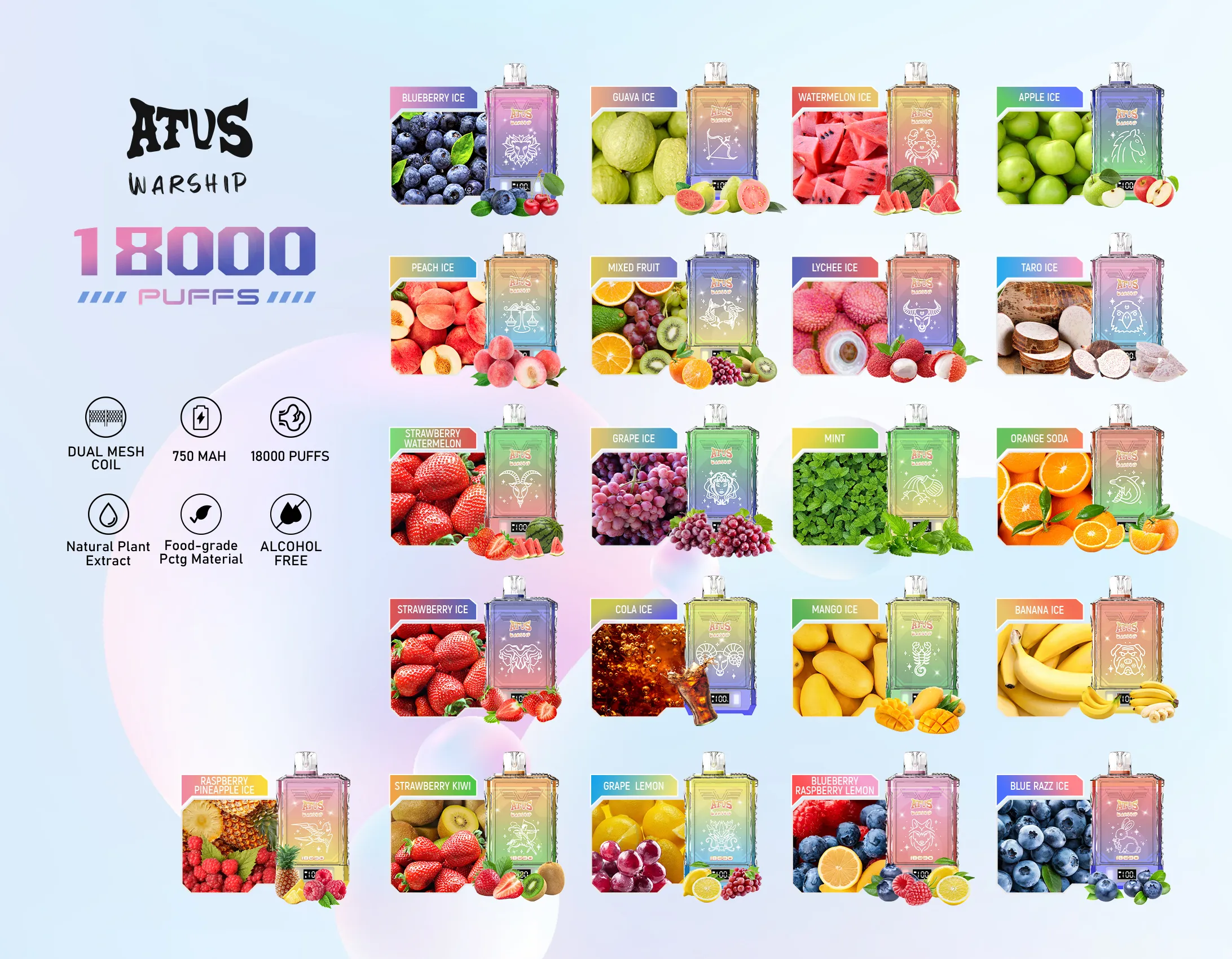 Ne glede na to, ali imate raje sadne, mentolne ali osvežilne okuse, ATVS WARSHIP 18000 PUFFS ponuja nekaj za vsakogar. Preizkusite celoten spekter arom, ki so na voljo v naši ponudbi: